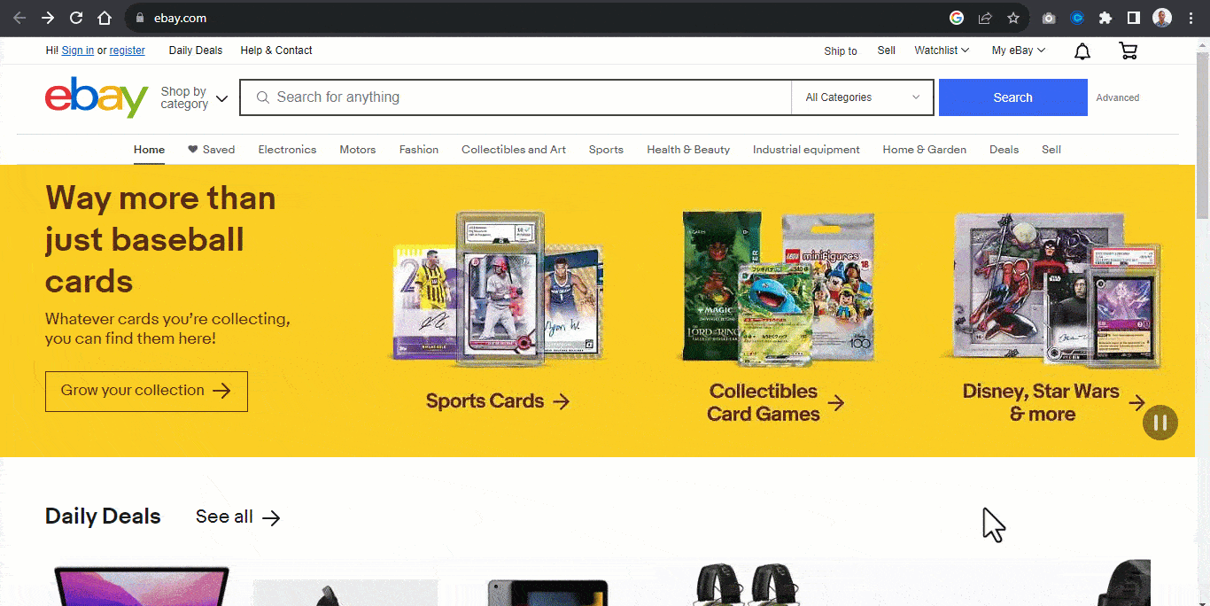 The banner carousel sits typically on top of the page and rotates continuously, one slide at a time. For example, a simple banner carousel from eBay sits on top of the site and displays different types of ads in a slideshow manner.