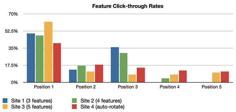 A study based on Google Analytics Event recorded the number of interactivity. The report states the percentage of visitors who clicked on a carousel feature is 1%, with the first feature getting the highest clicks or interactivity. In contrast, other features have to share the same or no interaction.