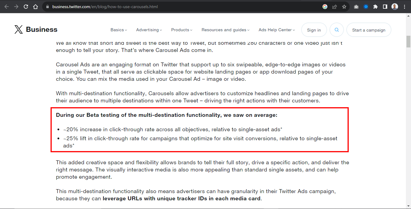 According to beta testing of the multi-destination function on the carousel by X Business, they saw a 20% increase in click-through rate across single posts of carousel assets and a 25% lift in click-through rate for campaigns that optimize for site visit conversion.