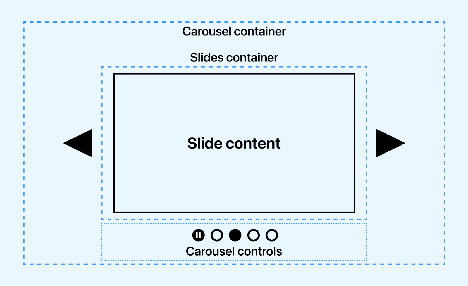 • Buttons, slides, slider picker controls, play/pause state buttons, and other carousel components should be implemented and labeled accordingly to make them accessible.